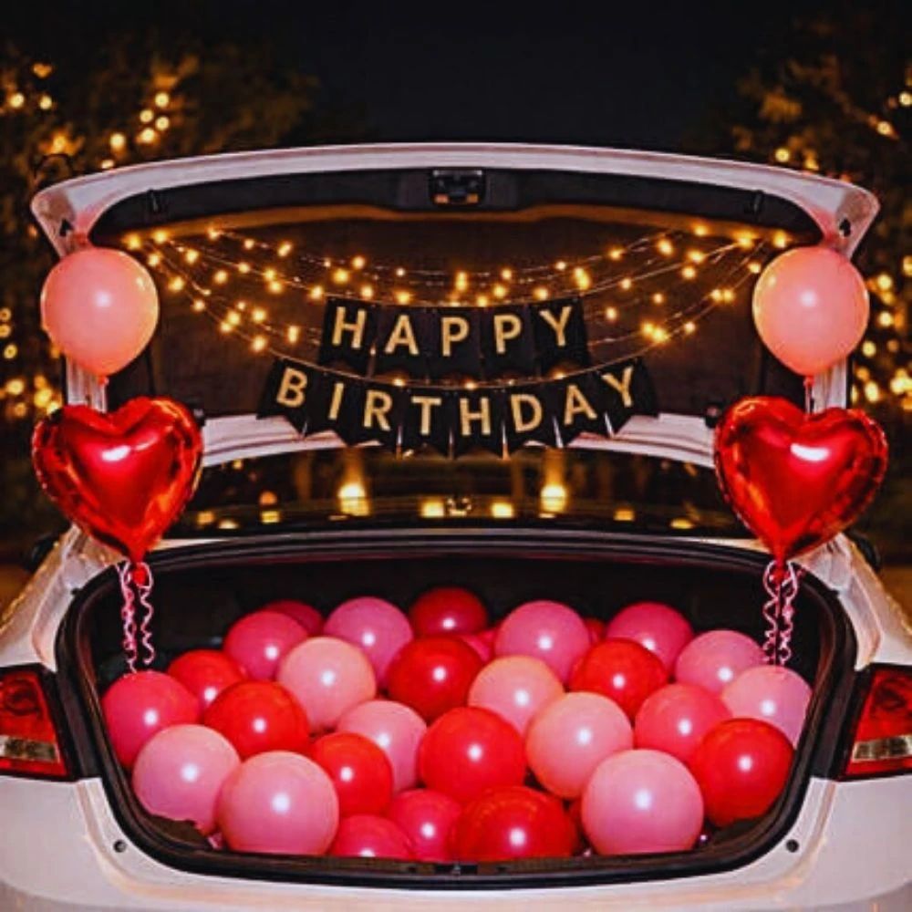 Car boot decoration is a surprise setup inside the car’s boot using balloons, lights, banners, and props to create a magical reveal for your loved one.